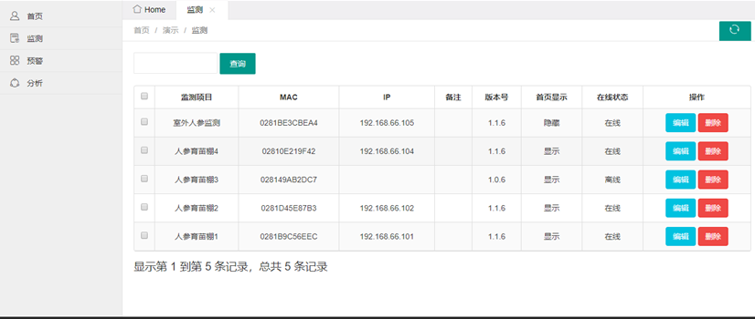 首頁顯示監測數量、傳感器數量、監控數量、預警信息、最近24小時溫濕度監控以及須在首頁顯示的監測。