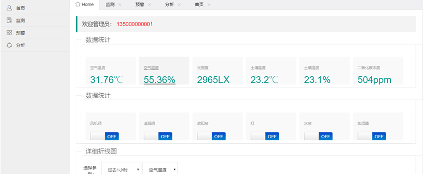 在【監測】頁面,點擊列表右側詳情按鈕,進入監測詳情界面。上面部分顯示傳感器當前狀況,下面部分分別顯示開關控制、數據統計以及預警參數。