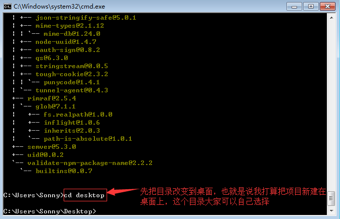要創建項目,首先我們要選定目錄,然后再命令行中把目錄轉到選定的目錄。在這里,我選擇桌面來存放新建的項目,則我們需要先把目錄cd到桌面,如下圖。