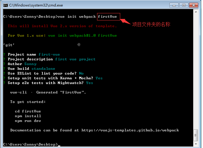 在桌面目錄下,在命令行中運行命令 vue init webpack firstVue 。解釋一下這個命令,這個命令的意思是初始化一個項目,其中webpack是構建工具,也就是整個項        目是基于webpack的。其中firstVue是整個項目文件夾的名稱,這個文件夾會自動生成在你指定的目錄中(我的實例中,會在桌面生成該文件夾),(運行初始化命令的        時候回讓用戶輸入幾個基本的選項,如項目名稱,描述,作者等信息,如果不輸入則直接回車方可)如下圖。