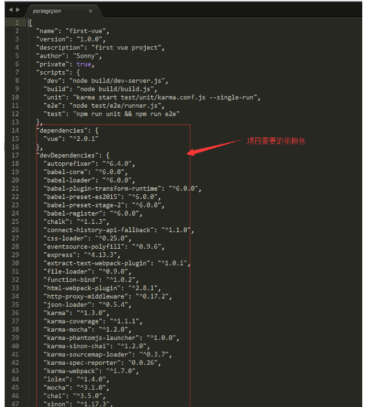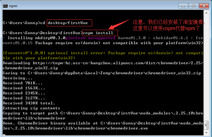 • 安裝項目所需的依賴:首先cd到項目文件夾(firstVue文件夾),然后運行命令 cnpm install