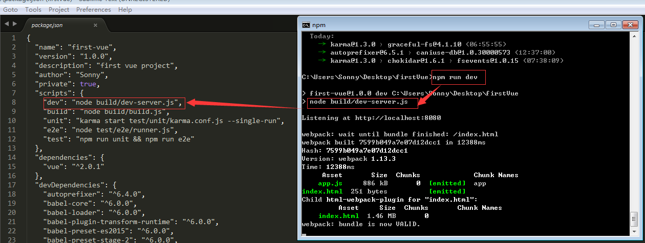 在項目目錄中,運行命令 npm run dev ,會用熱加載的方式運行我們的應用,熱加載可以讓我們在修改完代碼后不用手動刷新瀏覽器就能實時看到修改后的效果。