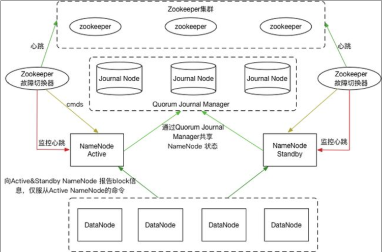 整個分布式文件系統將由數百或數千個存儲著文件數據片段的服務器組成。隨著數據量的不斷增大,其分節點的數量將會非常龐大,每個節點硬件都有出故障的可能,系統通過部署ZooKeeper(ZK服務注冊中心) 和 ZKFailoverController(ZKFC)組件實現故障自動轉移,以達到即便硬件出現故障數據依然完整的目的
